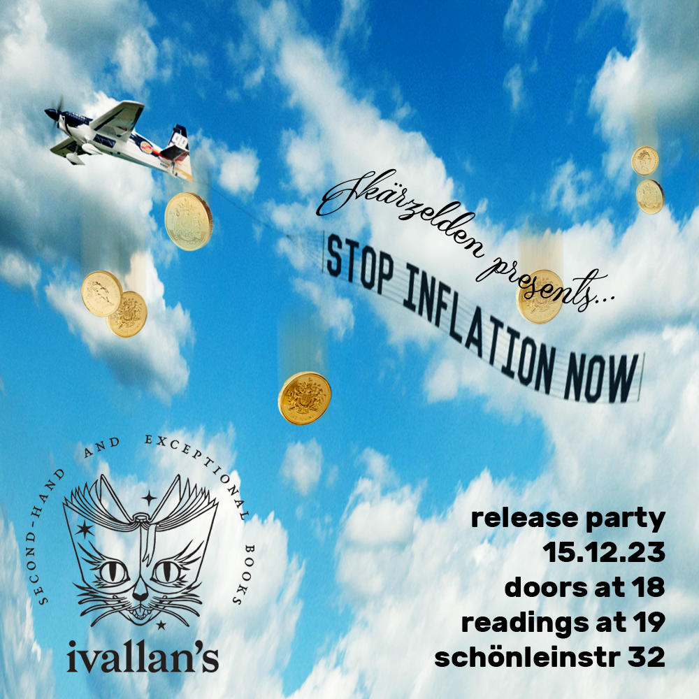 STOP INFLATION NOW £££ about $$$ archive €€€ Skärselden releases its first triumphant paper edition in these INFLATIONARY TIMES. 15.12.23, at Ivallan’s books, with readings! Inflation-adjusted fun for the budget conscious culture connoiseur